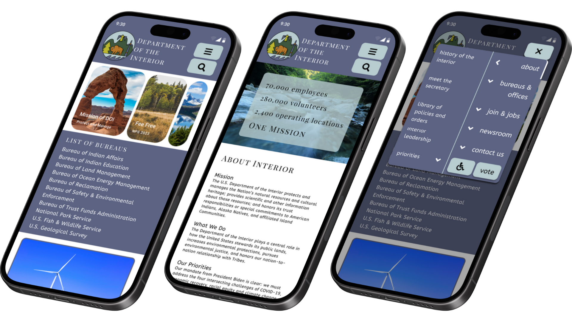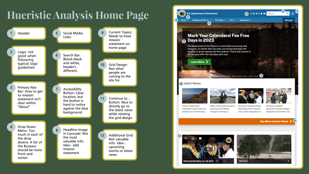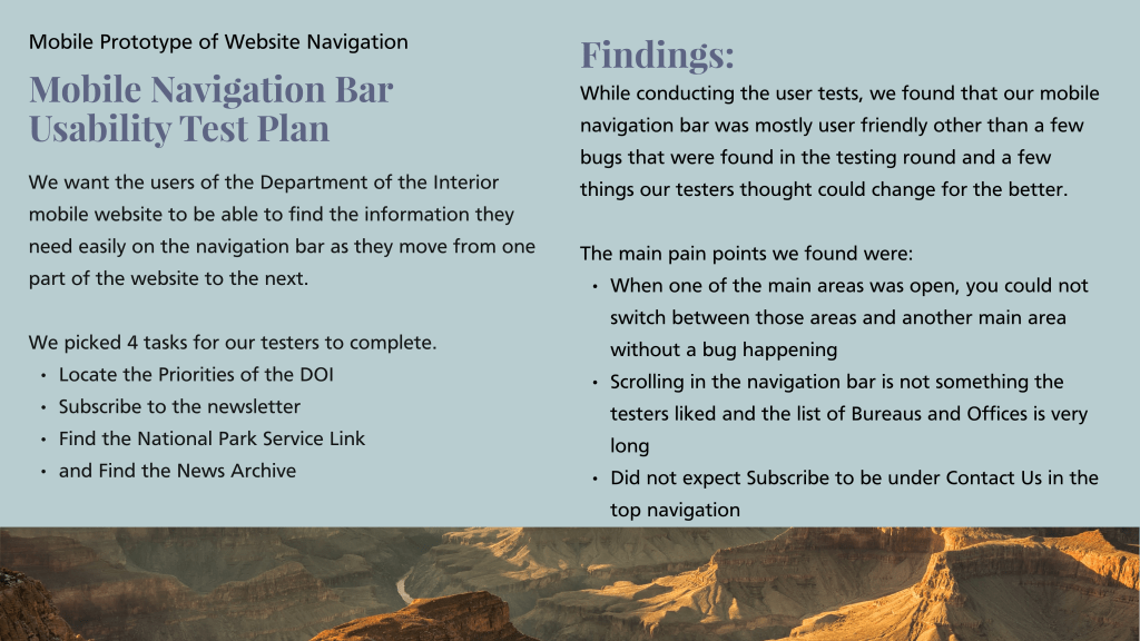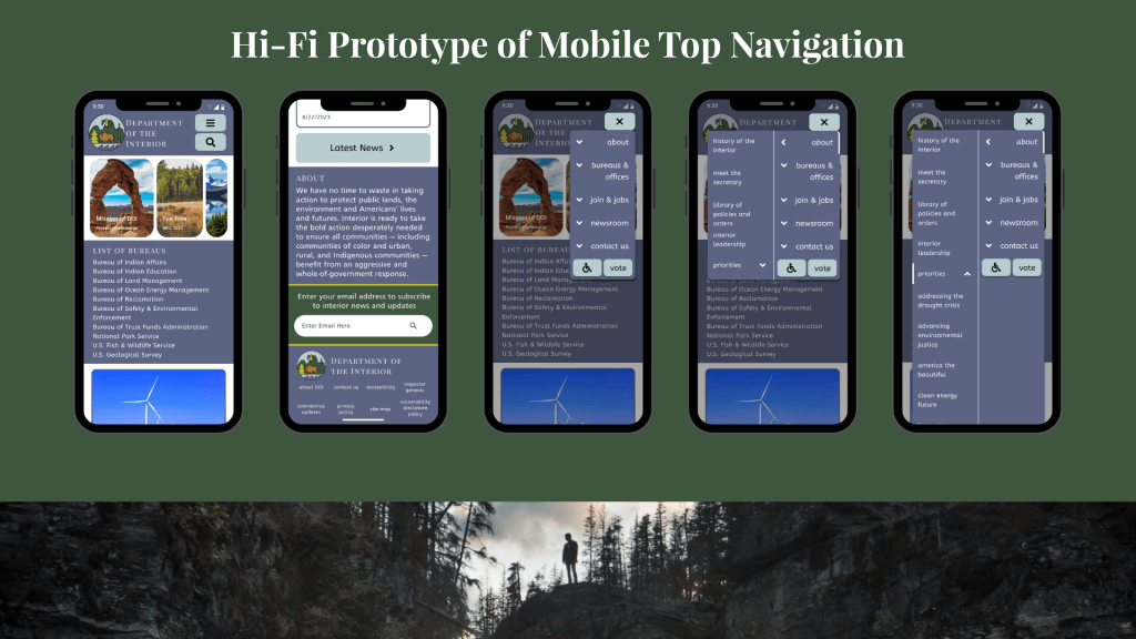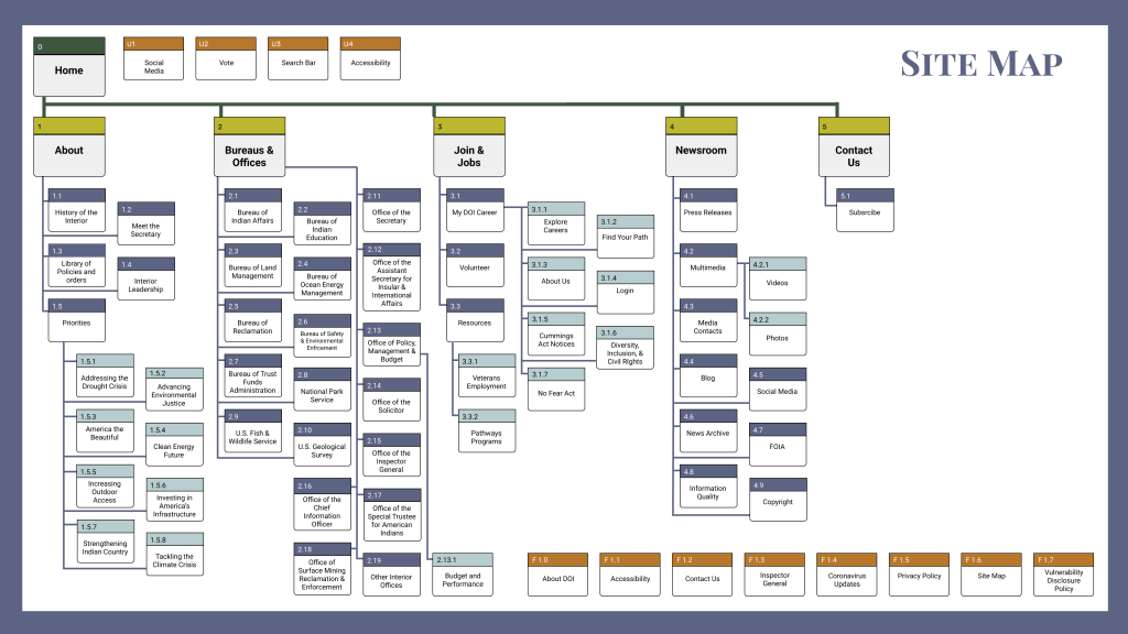 By redesigning the current site, my team improved navigation and make the mission and vision statements clearer so anyone who visits the site can easily understand what the Department of the Interior is all about.